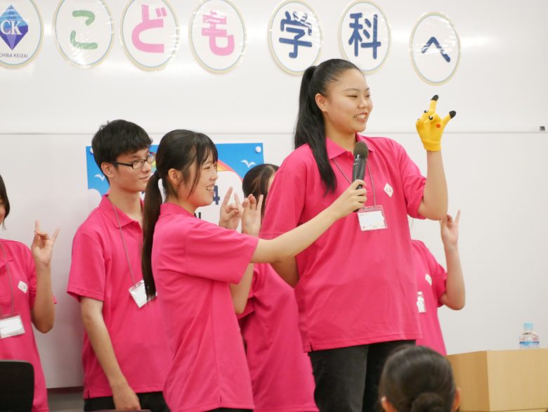 こども学科は、清水洋生先生とキッズビジネスコース2期生で、千葉市内にあるダンススクール「LIT OF DANCE」を起業した卒業生によるミニ授業「身体を使って遊ぼう!ノリノリ♪ダンス体験★」が行われました。ダンスの初歩的な動きを学びながら、じゃんけんを取り入れるなど、みんなが笑顔になる仕掛けもあって、会場全体が盛り上がりました。
