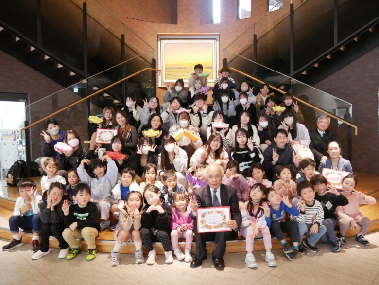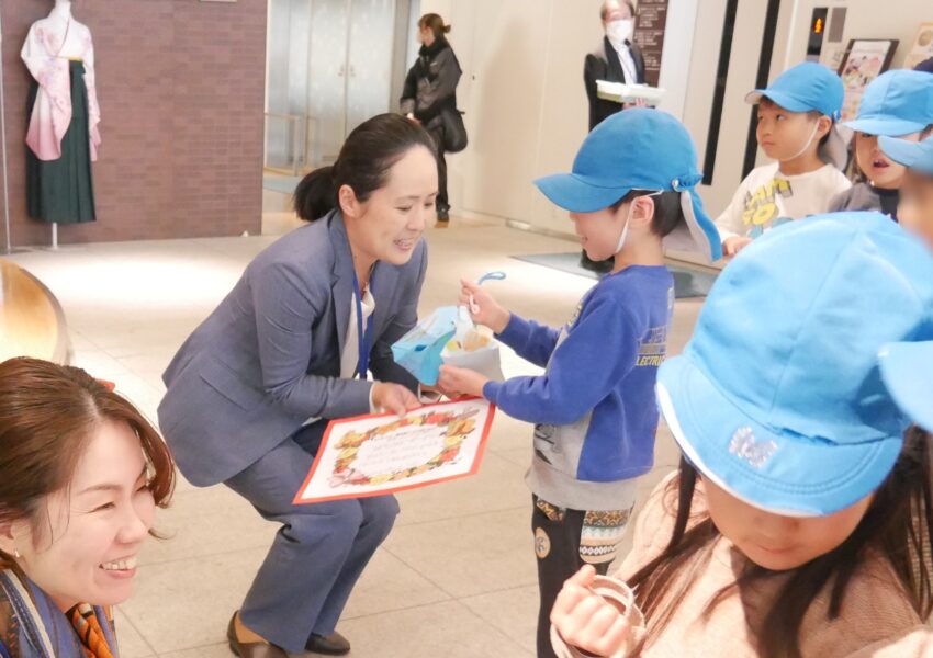 11月18日(火)本学のエントランスにて、小ばと会なでしこ保育園によるサンクスギビング(感謝祭)が開催されました。園児のみなさんが、いつも遊んでくれる学生と教員に「ありがとう」の気持ちを伝えに来てくれました。