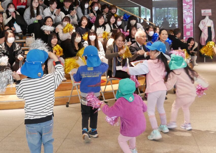手作りバックに入った果物のプレゼントとメッセージカードを頂きました。園児のみなさんが綺麗な歌声で讃美歌を披露してくれた後は、やきいもグーチーパーの手遊び歌を学生も一緒に歌いました。学長先生とのじゃんけんが盛り上がったところで、最後はキラキラのサンバ棒を手に持った子ども達が「マツケンサンバ」を元気よく踊ってくれました。