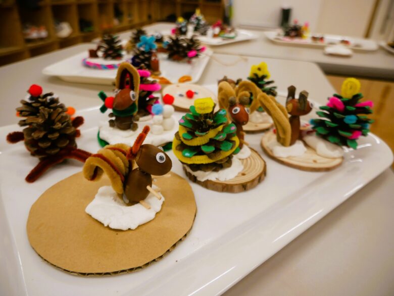 視線を下げて見ていくと、思い思いのクリスマスの景色がありました。木に見立てた小枝に雪が積もり、フェルトのマフラーを付けたドングリの兄弟が話している様子。モールのしっぽを付けたドングリのリスがマツボックリのトナカイを見ている様子。丸太にたくさんのモールを立ててマツボックリをその上に配置したものなど、バラエティーに富んでいます。
