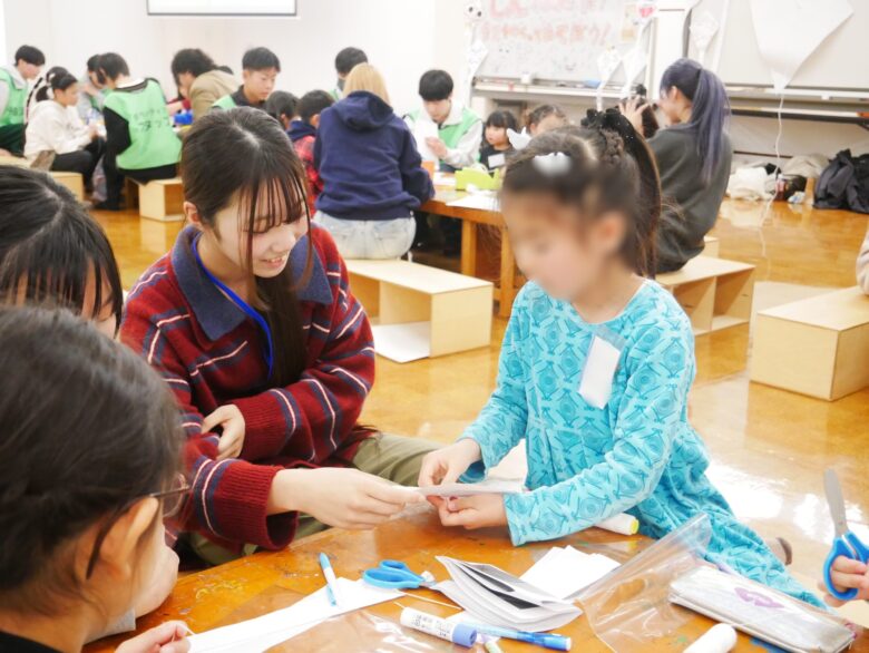 一番難しいのは穴を開けて糸を通すところです。これは学生ですね、ボランティアの皆さんが上手にリードしたり、難しければ手伝ったりしてみんなの凧が完成しました。