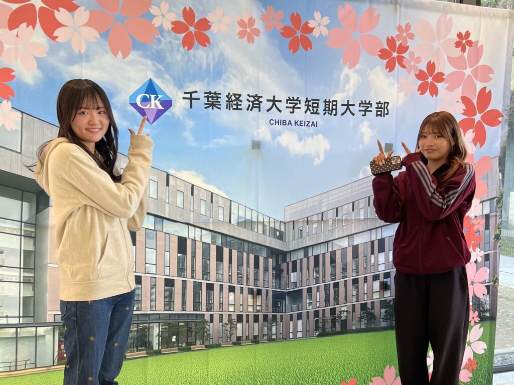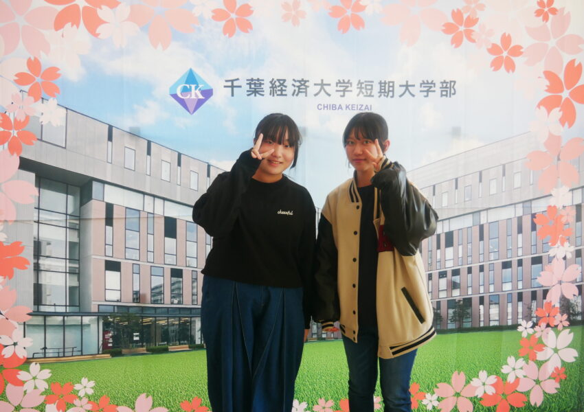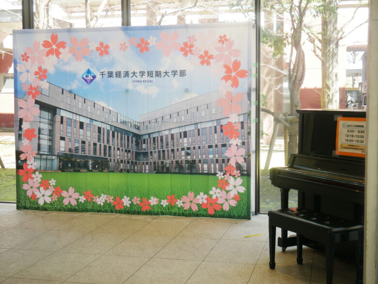 短大のエントランスには、入学をお祝いして、本学東側にある人工芝のグラウンド「ひろはらスクエア」の写真を背景にした撮影パネルが設置されています。