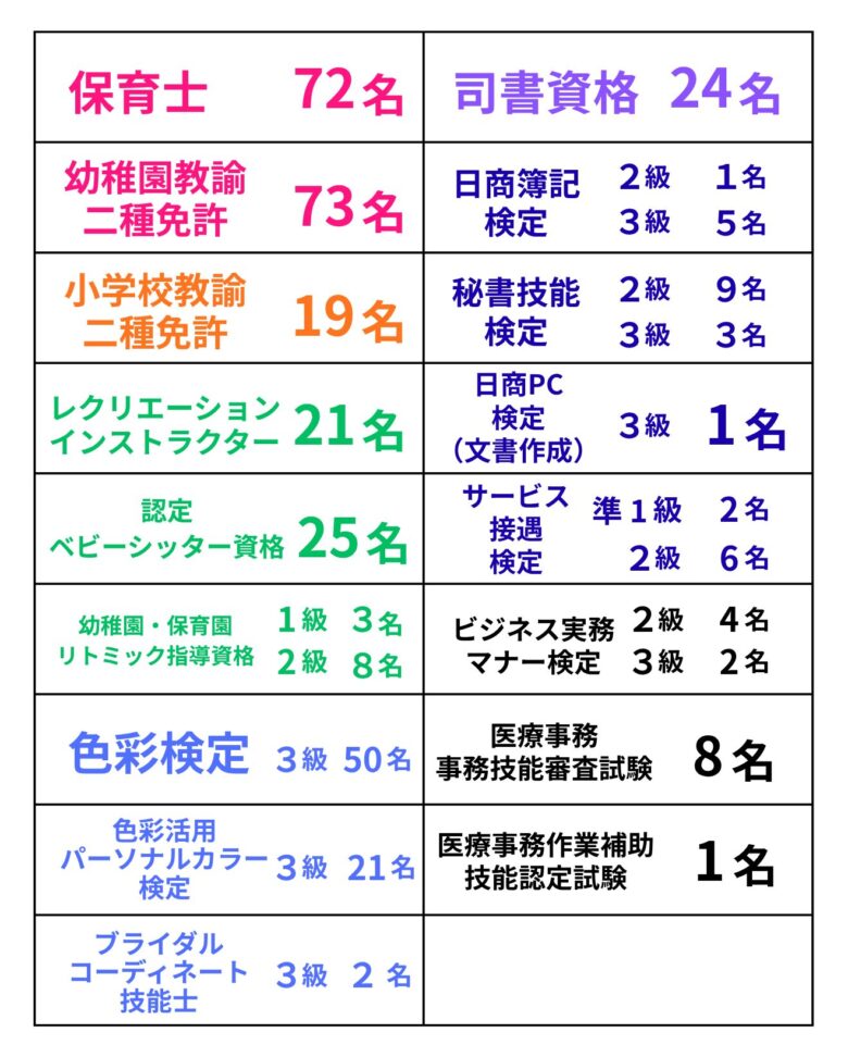がんばりが実りました! 2026年3月卒業の学生が2年間で取得した資格・免許です