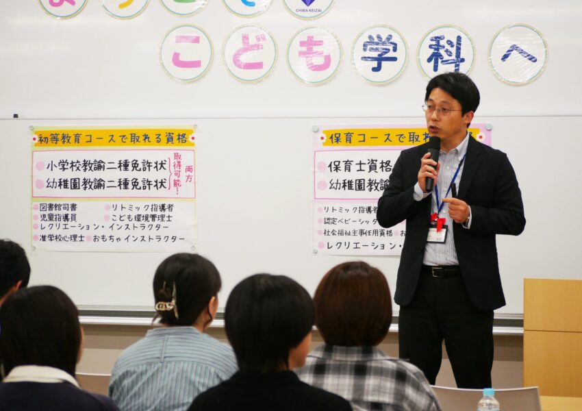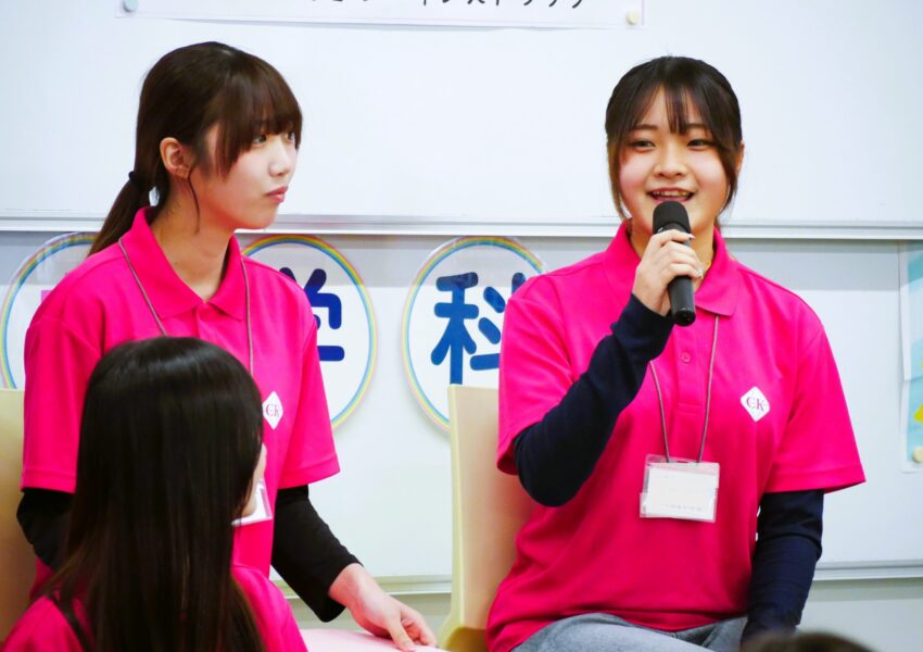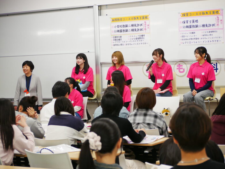 こども学科保育コース、初等教育コース、キッズビジネスコースに在籍している学生たちが 登壇して、リアルなキャンパスライフを語ってくれました。